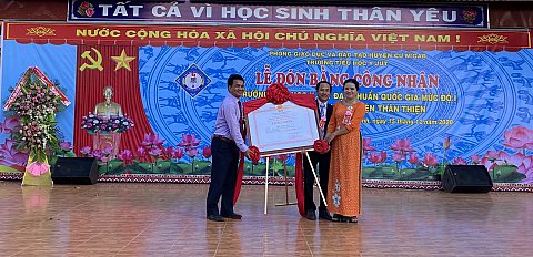 Đ/c Y Wem Hwing - Phó Chủ tịch UBND huyện trao bằng công nhận đạt chuẩn quốc gia cho nhà trường tiểu học Y Jút